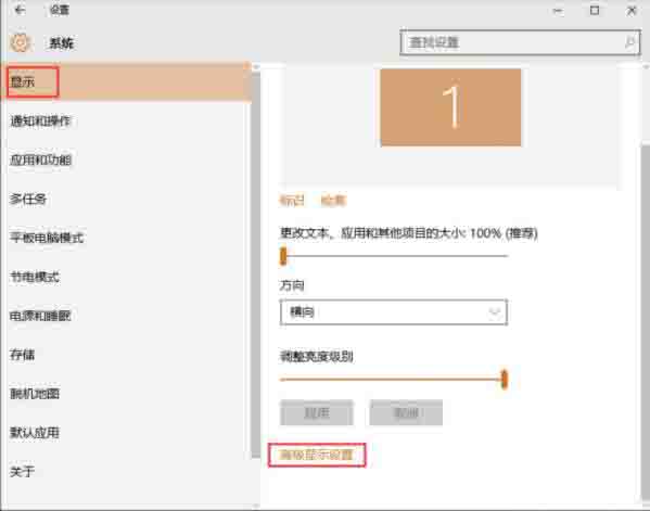 3。单击[系统]功能选项进入系统设置界面,在左侧菜单栏中选择[显示],然后下拉该界面找到[高级显示设置]功能选项;如图所示: