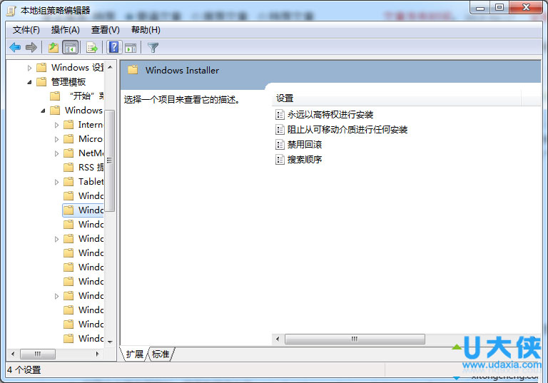 3、本地组策略编辑器窗口中展开左侧菜单中的计算机配置→管理模板→Windows组件→Windows Installer,然后在右侧窗口中找到“关闭创建系统还原检查点”,双击设置为“启用”。