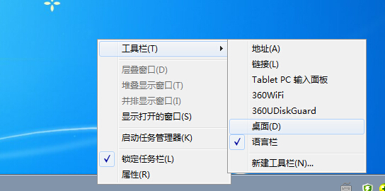 1.任务栏空白处单击鼠标右键,菜单中鼠标指向工具栏,在次级菜单中点击勾选“桌面”即可。如果任务栏被隐藏,要让它显示出来。