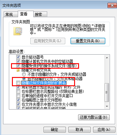 2)然后在弹出来的文件夹选项窗口中切换到“查看”选项卡,然后在高级设置框下,找到并取消勾选“隐藏已知文件类型的扩展名”和“隐藏受保护的操作系统文件”,点击确定;