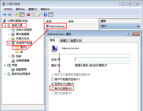 2.依次展开“系统工具”—“本地用户和组”—“用户”并在窗口右部找到“Administrator”双击打开它。然后单击“常规”标签,将“账户已禁用”的勾去掉,这样就开启了 Administrator(管理员)账户。