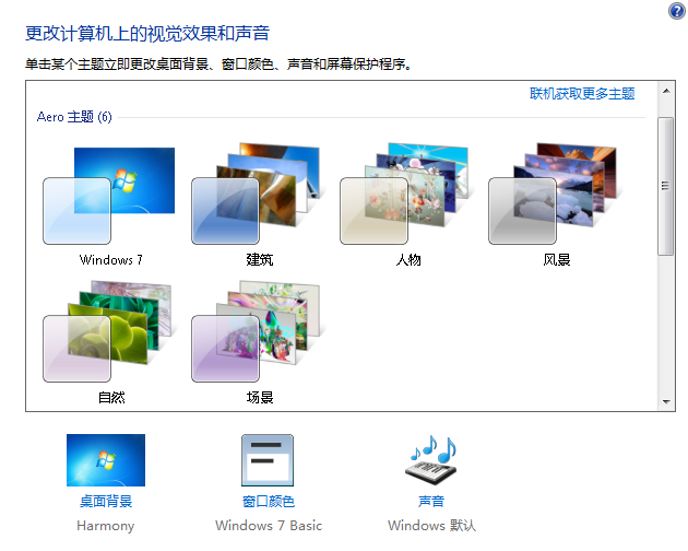 2、在弹出来的个性化窗口中选择Aero主题中任选一个主题进行更换桌面即可。