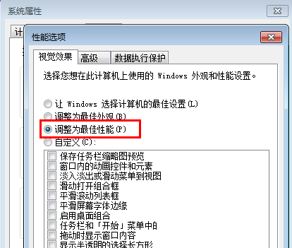 3、接着在性能选项窗口中选择视觉效果为“调整为最佳性能”,点击确定按钮保存退出即可。