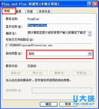 3.在打开的本地计算机属性窗口中,切换到“常规”项,选择启动类型(E)为“自动”点击确定完成设置。如下图所示