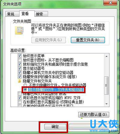 3、在“查看”分页找到“隐藏文件和文件夹”,把选择改为“显示隐藏文件、文件夹或驱动器”,在点击确定;