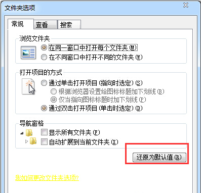 2、会弹出文件夹选项,选择图片所示,点击还原默认值按钮;