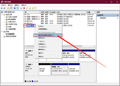 5、右键G盘,选择“更改驱动器号和路径”