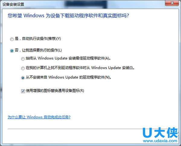 4、将“是,自动执行该操作”改为“否,让我选择要的操作”,然后选择“从不安装来自Windows updata的驱动程序软件”,再确定!