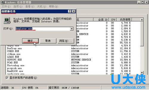 4、启动explorer.exe。在弹出的“创建新任务”对话框中的“打开”后边的编辑框中输入“explorer.exe”, 然后点击确定即可。