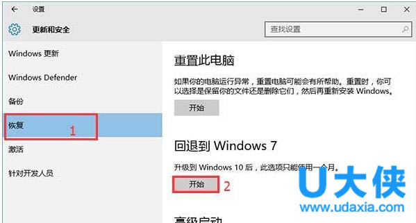 1、打开设置→更新和安全→恢复,找到“回退到windows 7”,点击“开始”。