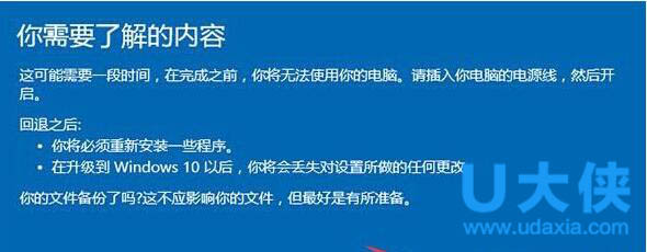 3、仔细阅读注意事项,全过程需要有稳定电源支持,也就是说笔记本需要在接入电源线的状态下进行回退操作,电池模式不被允许,另外系统还提示了一些关于文件和程序可能受到的影响。了解并采取措施之后,点击“下一步”继续。