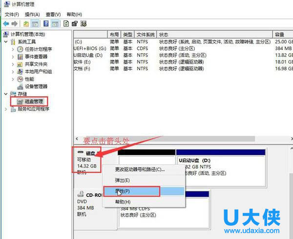 2、在计算机管理界面中选择存储工具下的“磁盘管理”选项,在中间的信息窗口中找到u盘,鼠标右键点击u盘,选择“格式化”。