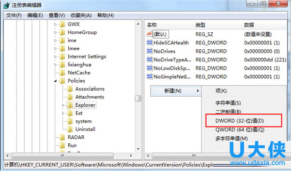 3、在窗口右侧单击右键,点击“新建”,选择“DWORD(32-位)值”,将其值名字修改为“NoSaveSettings”。