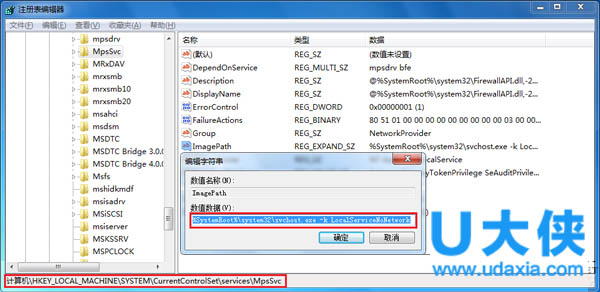 2、按“Windows+R”输入“regedit”回车打开注册表,并定位到HKEY_LOCAL_MACHINESYSTEMCurrentControlSetservicesMpsSvc,确认ImagePath的数值数据是否相同,如“%SystemRoot%system32svchost.exe -k LocalServiceNoNetwork”。