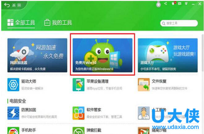 2.打开下图界面,中间位置即可看到:360 Windows 10 升级助手。
