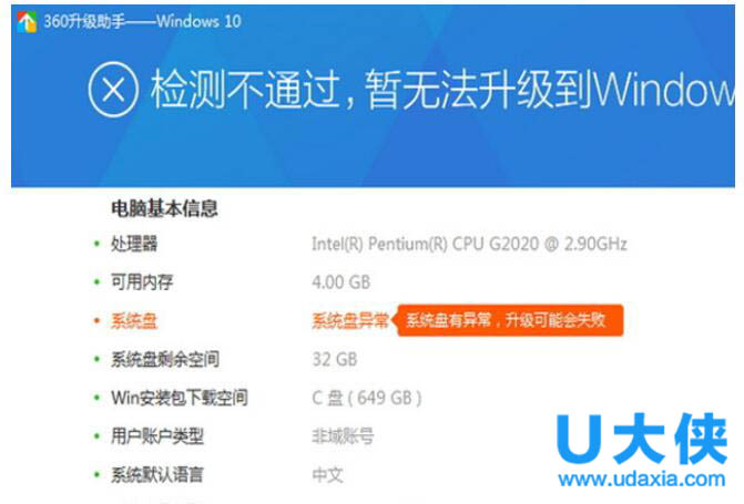 c. 系统环境是否满足Windows 10 的要求(如:用户账号,系统盘是否存在坏道)