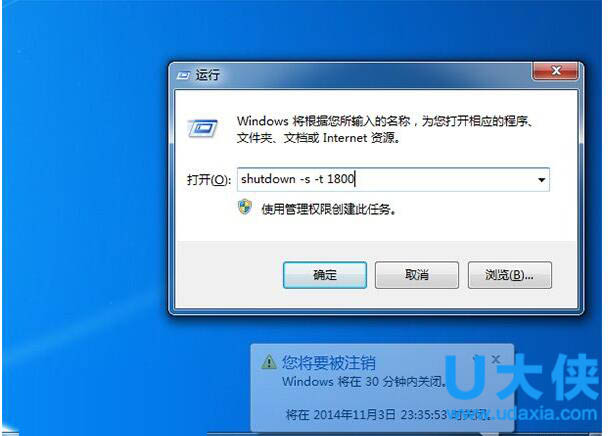 此处我们以设置系统半小时后关闭为例,需要输入的命令为:“shutdown -s -t 1800”,上述命令包含3个空格,不含引号。运行后系统任务栏右下角会弹出提醒窗口。