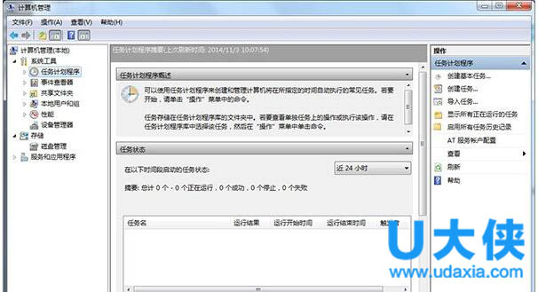 ① 在“计算机”上单击右键,点击“管理”。然后左键单击“系统工具”栏下的“任务计划程序”,最后在最右侧的“操作”栏中,点击“创建基本任务”。