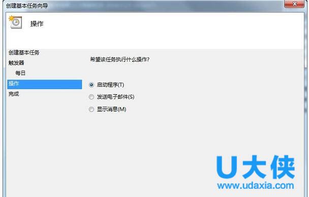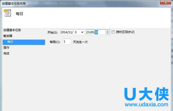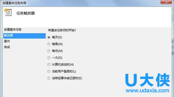 ③ 希望任务何时开始:只是使用一次,点选“一次”,然后点击“下一步”即可。这里我们选择了默认的“每天”。