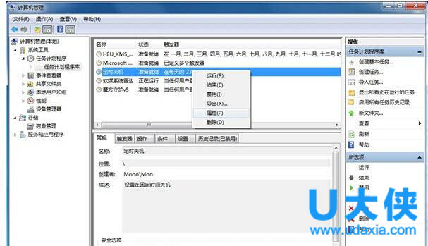 在“任务计划程序库”中找到我们的计划任务,单击右键点击“属性”,可以对其进行详细的修改,来完成我们的关机需求。