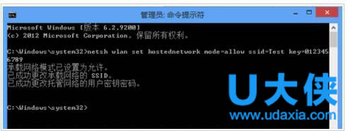 2、点击后,系统就以管理员权限打开了命令提示符,在命令提示符中输入以下命令“netsh wlan set hostednetwork mode=allow ssid=Test key=0123456789”(不包括双引号,下同),回车。