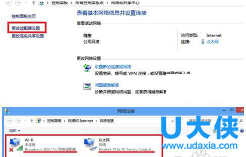 4、打开后,在窗口的左上,找到“更改适配器设置”,在打开的网络连接窗口中,我们并未找到win7下所出现的虚拟的无线网络连接,如下图所示,这是因为win8下,即使已允许网络承载模式仍然需要先启动,才能找到,这也是为什么很多用户找不到虚拟出的网络的原因。