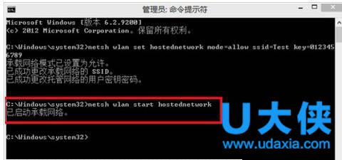 5、回到命令提示符窗口,输入命令“netsh wlan start hostednetwork”,回车,启动承载网络。