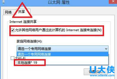 7、在以太网的网络连接上单击右键--属性,找到“共享”,选择虚拟出的网络,此时我们的wifi热点才算正式的建立了。