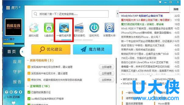 2、然后我们打开主界面,找到一键无线共享,并点击打开。