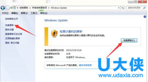 5、待打开“计算机管理”界面后,点击此界面左下角的“Windows Update”按钮,从打开的“Windows Update”界面中,点击“检查更新”按钮。