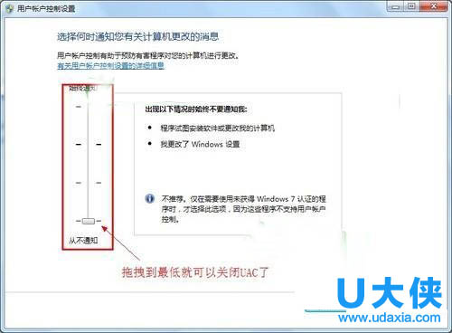 UAC在Win7中的完善就是因为UAC太烦了,所以微软在Win7中,加入了UAC的等级设置功能,分别对应4个级别: