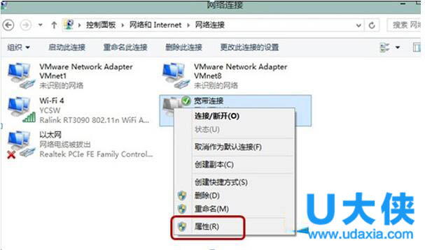 第三步,找到“宽带连接”,右键点击选择“属性”。