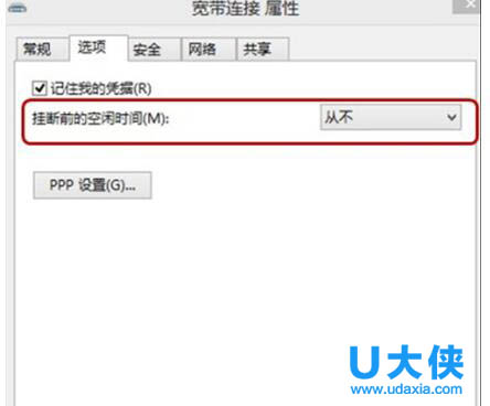 第四步,在“宽带连接”属性设置界面,选择第二项“选项”,将“挂断前的空闲时间”改为“从不”,保存退出即可。