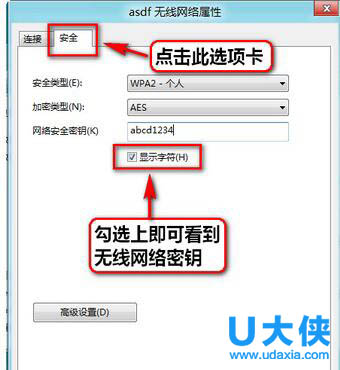 4、打开“安全”选项卡,勾选上“显示字符”即可查看到无线密钥。