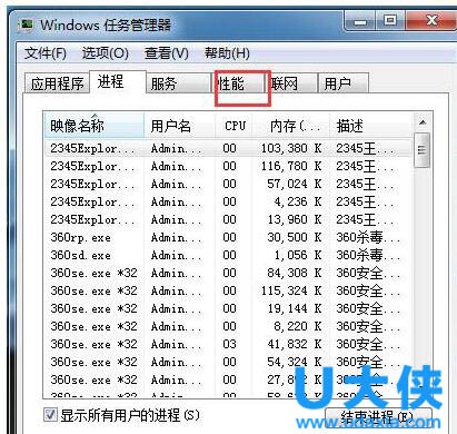 2、在弹出的Windows任务管理器选项卡中选择性能选项,在这里就可以查看电脑的CPU使用情况了。