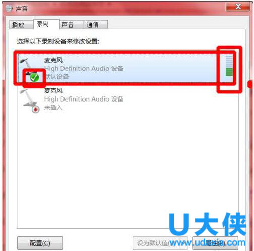 2.可以进入系统的控制面板,选择声音选项,在标签选择录制,如果有打了绿色钩子的麦克风,而且右侧的绿色格子不停的跳动,就说明已经有了麦克;如果确定自己的设备有麦克,那可以试着更新您的声卡驱动,或者再外置一个麦克就可以了。这里提示一下,一般下面有一个红色向下箭头的图标,表示您有一个麦克的插口可以用,但是没有插入麦克风。