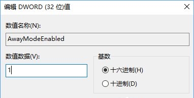 4、双击打开“AwayModeEnabled ”值,把数值数据修改为“1”点击确定;