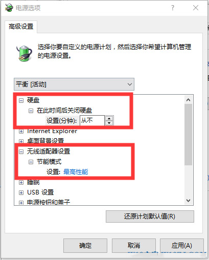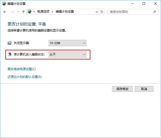 7、将“使计算机进入睡眠状态”下拉菜单设置为“从不”;