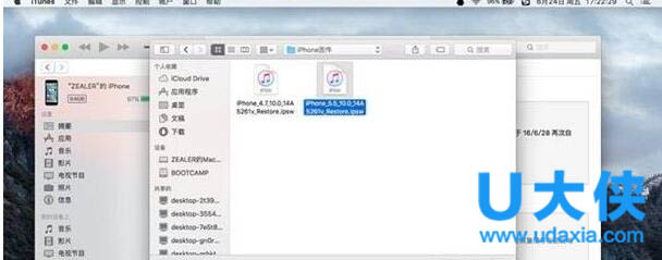 在键盘上按住 option 键,同时点击 iTunes 界面中更新或恢复(此操作会删除所有数据),选择对应机型的刷机固件,如图。