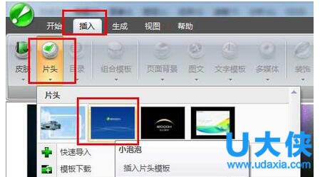 四、封面替换完后,可以为自己的杂志一个超炫的片头动画。在软件”插入”菜单下面任意插入一个片头。例如插入小泡泡这个片头,如下图: