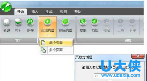 八、如果您插入上述元素后都还不够,您可以选择再添加更多的版面进去编辑。方法:“开始”菜单下“添加页面”“多个页面”,然后输入页数即可。建议不 要输入太大。如下图: