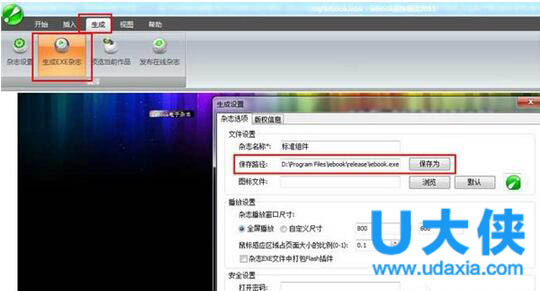 九、现在只需要生成EXE电子杂志文件就可以在本地阅读自己精心制作的第一电子杂志了。方法:在生成菜单下面点击杂志设置,设置一下信息,还有保存路径。如下图: