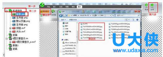 五、插入”小泡泡“这个片头后,需要编辑一下,方法:点击“页面元素”前加号,然后单击“片头”加号,双击需要替换的图片后,进入编辑界面,之后的替 换方法与封面替换方法一样。打开要更改的图片,点击”应用“即可,替换其他图片的方法都相同。如下图: