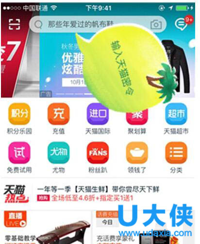 第一步、下载天猫app,不能使用淘宝app里的天猫,复制密令内容粘贴在顶部搜索栏