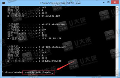 4、在这里,输入“ipconfig /displaydns”命令回车,如下图。