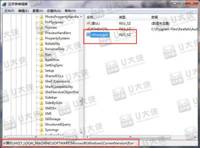 2、依次展开:HKEY_LOCAL_MACHINESOFTWAREMicrosoftWindowsCurrentVersionRun,在右侧单击右键,新建—字符串值,命名为ctfmon.exe,点击确定,如图所示: