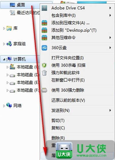 3、更改桌面位置,在D盘建立一个文件命名Desktop,打开计算机,在左边树形图中桌面项目右键-在菜单中选择属性,如下图: