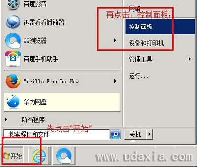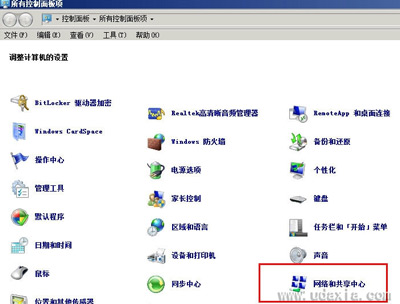 在系统桌面左下角部分,鼠标点击“开始”图标,在弹出的列表中,选择“控制面板”,点击打开,会新弹出一个叫“所有控制面板顶”的新窗口,找到叫“网络和共享中心”选项后,点击打开,如下图: