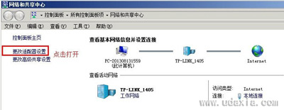 2、打开“网络和共享中心”窗口后,选择窗口左上角“更改适配器”点击打开,如下图: