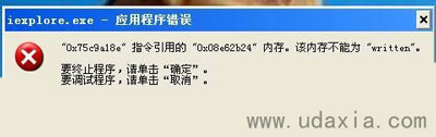 5、对于另一种应用程序出错,截图显示“应用程序出错,**内存地址不能读或不能写”,这种情况最复杂,若以上方法不能解决,则很可能是硬件(主要是内存)故障,可能是兼容性不良,只能联系硬件供应商修理。或者重装系统,重装后短时间内可能会有效。